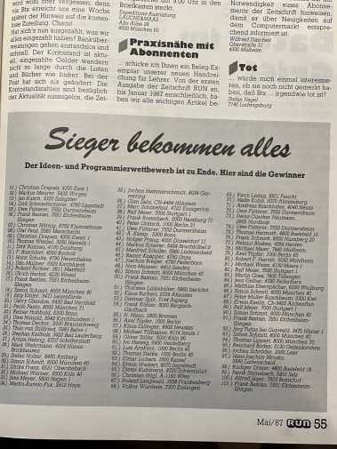 Alle Spiele (100% pur Assembler) wurden über Spiele-Publisher vertrieben. Auf der CeBit wurde ein Spiel öffentlich vorgestellt und als bestes Spiel ausgezeichnet (1987).