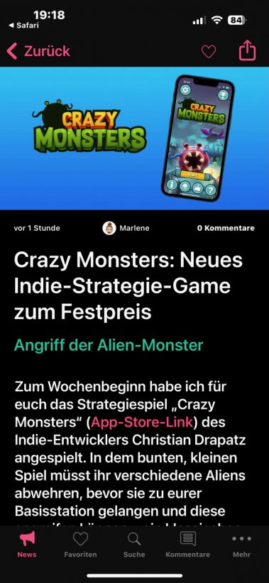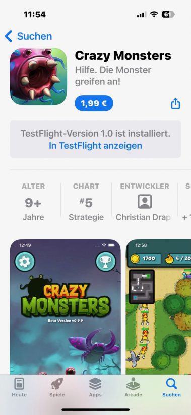 **Crazy Monsters** ist ein Tower Defense- und Strategiespiel für iOS, das speziell für Fans von Strategiespielen entwickelt wurde. Das Spiel bietet eine unkomplizierte, aber unterhaltsame Spielerfahrung und funktioniert auch ohne Internetverbindung. Mit seiner klaren, übersichtlichen Grafik sorgt es für schnellen Spielspaß ohne Ablenkung. Ein großer Pluspunkt: Einmal bezahlen und unbegrenzt spielen – In-App-Käufe gibt es hier nicht. Perfekt für alle, die unkomplizierte Unterhaltung suchen! Direkter Aufstieg auf Platz 19 in Deutschland (Ende 02/2024). Testbericht: appgefahren.de